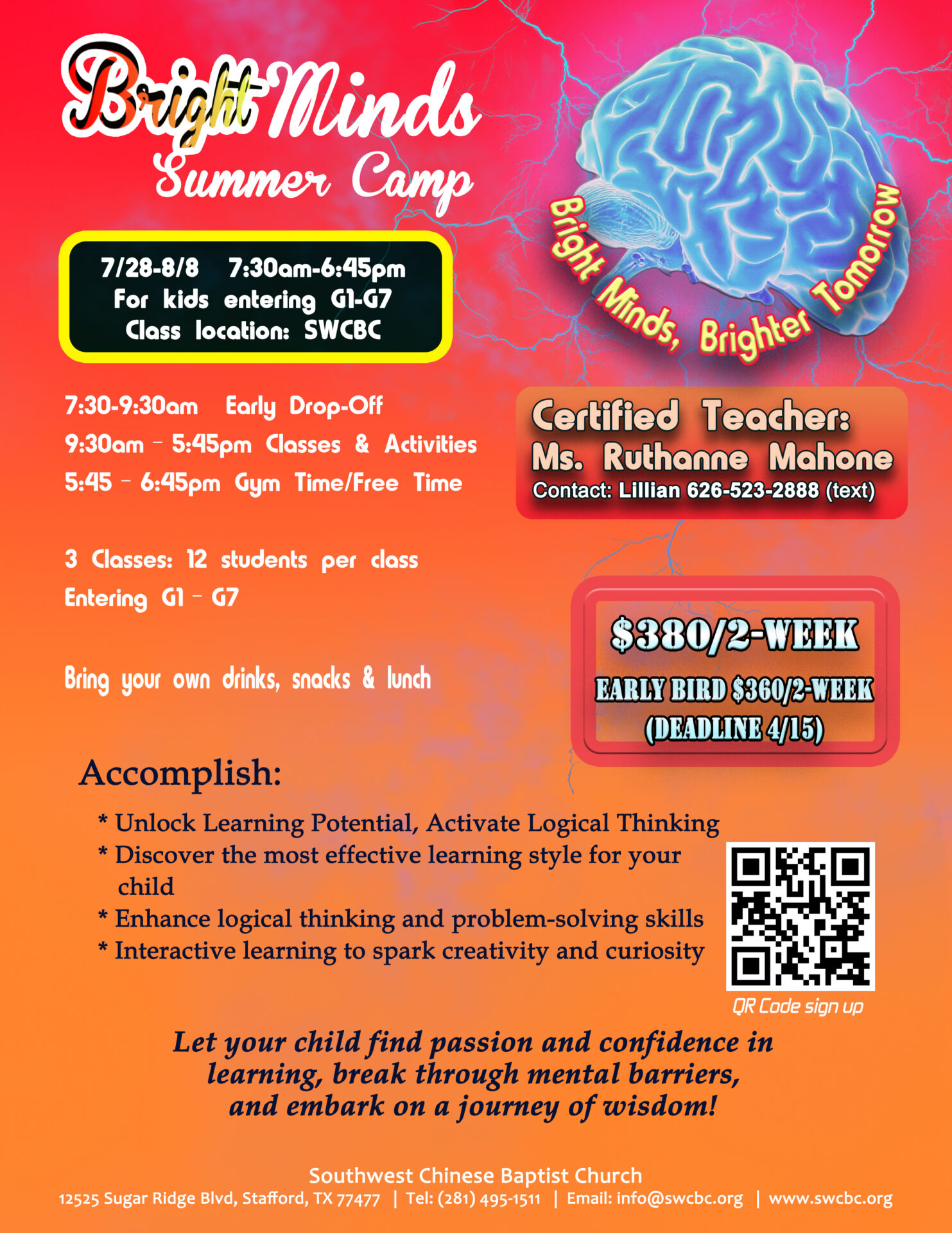 This course requires special class placement. This registration is for sign-up purposes only. The summer camp coordinator, Lillian Chan, will notify you of the admission results via phone or text message.